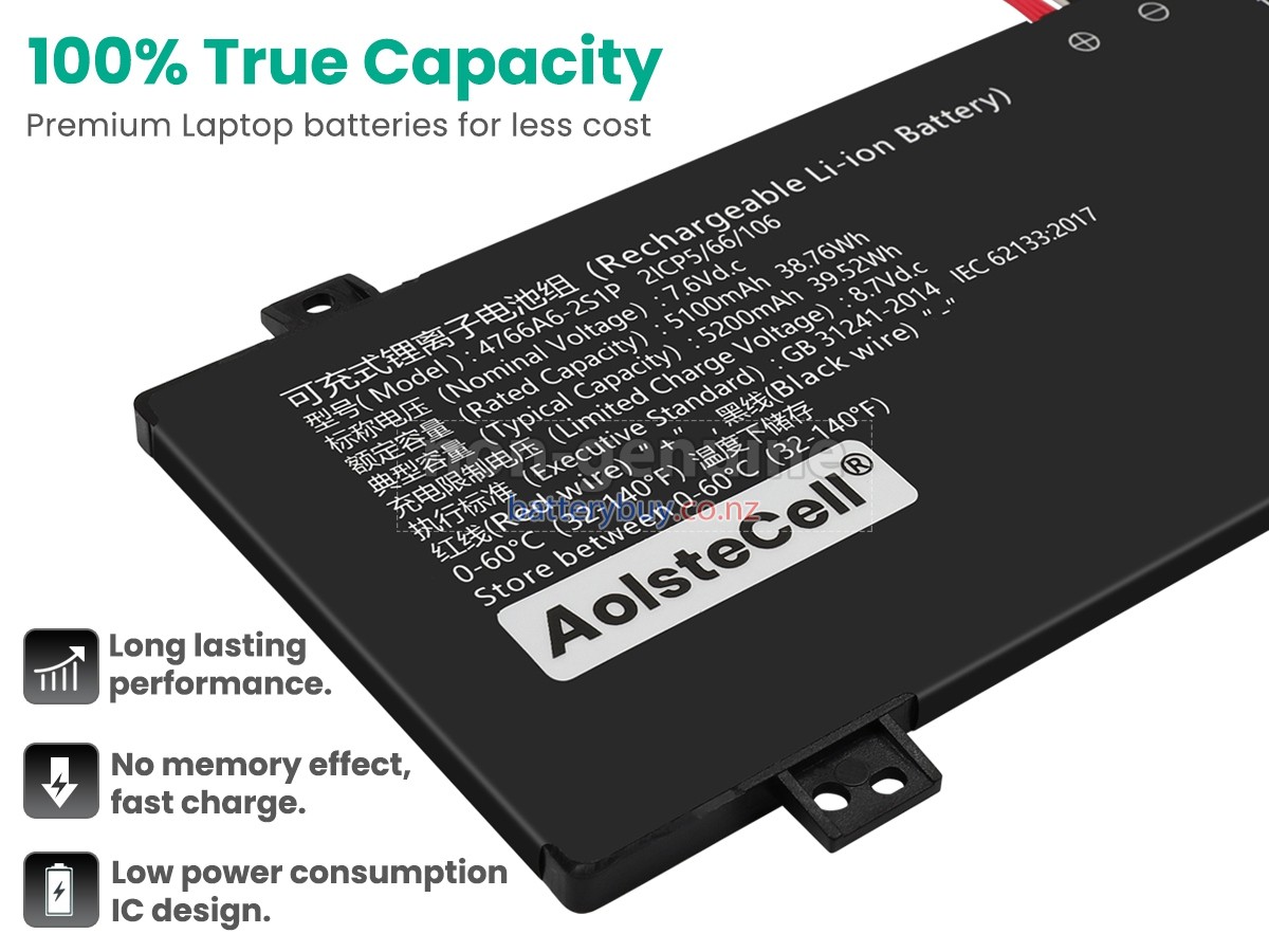 Welcome to BatteryBuy.co.nz buy the replacement laptop battery for AolsteCell 4766A6-2S1P! We specialize in providing high-quality laptop batteries. All of our laptop batteries have been rigorously tested for reliability and safety to ensure high-quality and standards. The specifications of the replacement laptop battery for AolsteCell 4766A6-2S1P is the same as the original battery and 100% compatible with your AolsteCell laptop. The AolsteCell 4766A6-2S1P laptop battery replacement use Li-Ion battery technology to replace the aging system battery or as a backup battery. All AolsteCell laptop batteries are manufactured with high-quality components that give each battery the highest quality. All of our replacement laptop batteries are Long-lasting life and Longer standby time.