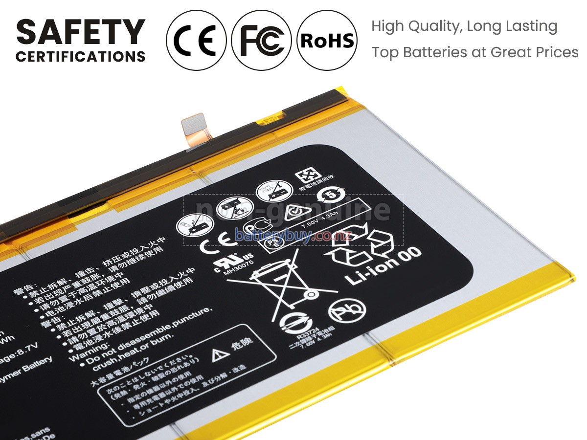 Welcome to BatteryBuy.co.nz buy the replacement laptop battery for Huawei HB25B7N4EBC! We specialize in providing high-quality laptop batteries. All of our laptop batteries have been rigorously tested for reliability and safety to ensure high-quality and standards. The specifications of the replacement laptop battery for Huawei HB25B7N4EBC is the same as the original battery and 100% compatible with your Huawei laptop. The Huawei HB25B7N4EBC laptop battery replacement use Li-Ion battery technology to replace the aging system battery or as a backup battery. All Huawei laptop batteries are manufactured with high-quality components that give each battery the highest quality. All of our replacement laptop batteries are Long-lasting life and Longer standby time.
