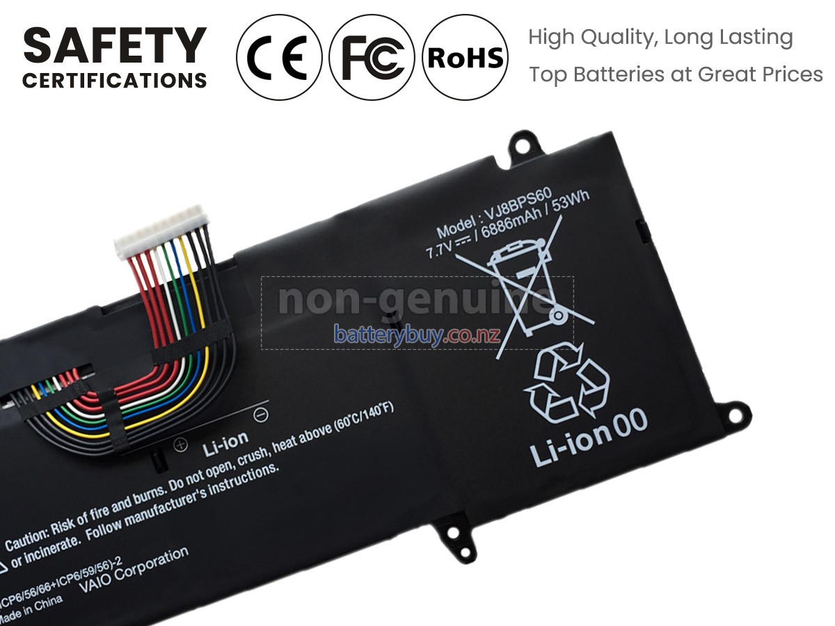Welcome to BatteryBuy.co.nz buy the replacement laptop battery for Sony VJ8BPS60! We specialize in providing high-quality laptop batteries. All of our laptop batteries have been rigorously tested for reliability and safety to ensure high-quality and standards. The specifications of the replacement laptop battery for Sony VJ8BPS60 is the same as the original battery and 100% compatible with your Sony laptop. The Sony VJ8BPS60 laptop battery replacement use Li-Ion battery technology to replace the aging system battery or as a backup battery. All Sony laptop batteries are manufactured with high-quality components that give each battery the highest quality. All of our replacement laptop batteries are Long-lasting life and Longer standby time.